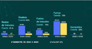 No mesmo comparativo do primeiro semestre entre 2024 e 2025, a tendência de queda na criminalidade se manteve. De acordo com o balanço estatístico da SSP, houve redução de 26,65% nos roubos e redução de 40,32% nos roubos de veículos.
