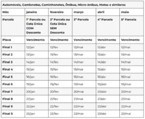 Os proprietários poderão escolher entre as seguintes formas de pagamento com vencimentos de acordo com o final de placa do veículo: