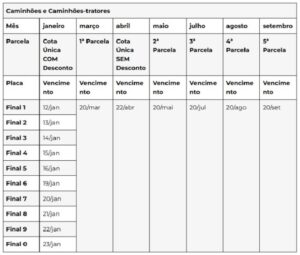 Os caminhões têm prazos diferentes: para o pagamento integral em janeiro é concedido desconto de 3%; aos que escolherem pagar em cota única, sem desconto, é 22 de abril. Para os proprietários que optarem pelo parcelamento em três, quatro ou cinco vezes, sem desconto, os vencimentos serão de março e setembro todo dia 20.